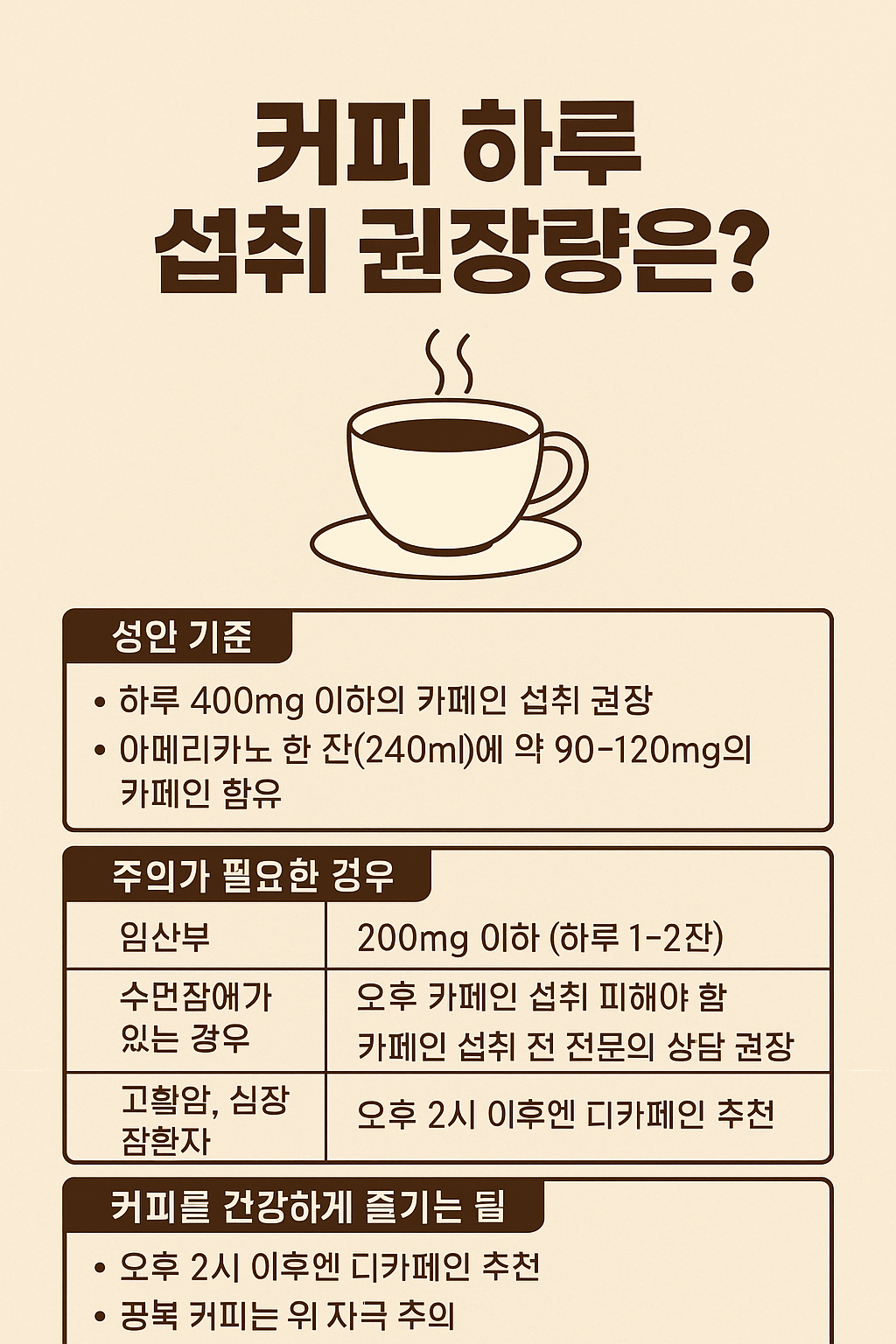 “커피는 하루 3잔까지는 괜찮지만, 타이밍과 몸 상태에 맞게 조절하는 것이 진짜 건강한 커피 습관입니다.”